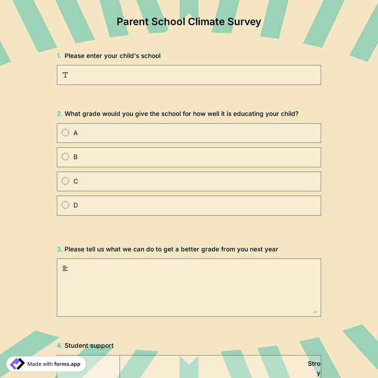 A positive school climate is the result of a school's efforts to promote safety and high-quality learning, social, and environment. You can use this free and ready-made parent school climate survey template on forms.app to create your custom survey and collect parent opinions about the school.