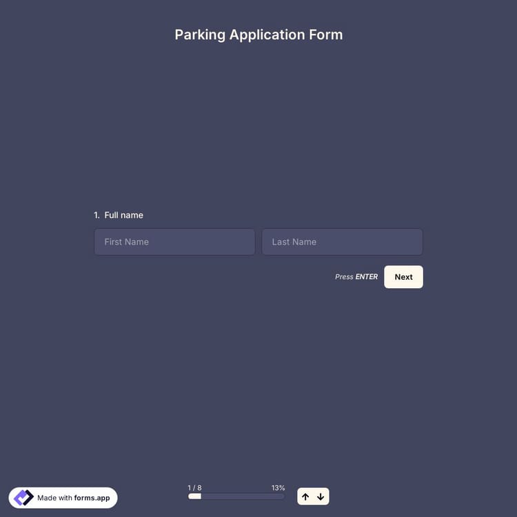 An online parking application form allows you to find trusted places to park your vehicles. Plus, you don't have to worry about searching for parking spaces and finding vacancies. forms.app lets you use these application form templates for free. Not only will you save time, but you can also collect applications easily.