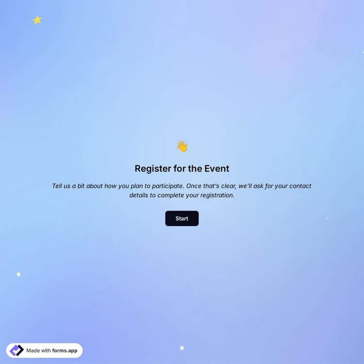 Just tell us how you would like to have a custom participant registration form for your specific needs. forms.app’s AI online form builder will create a free template for you in seconds.