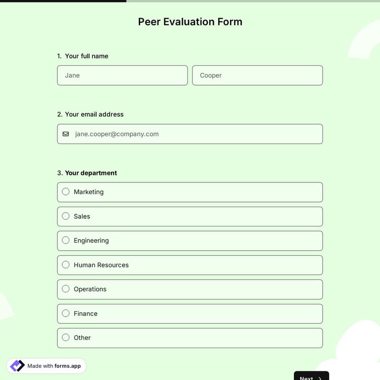 You can create a peer evaluation form by using this template, or you can use our free AI form builder, or you can also create a form from scratch with no code.