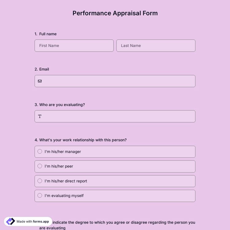 An online performance appraisal form is an evaluation survey to review one's job performance. It usually includes a set of questions to gather information on an employee's work, strengths, and areas for improvement.