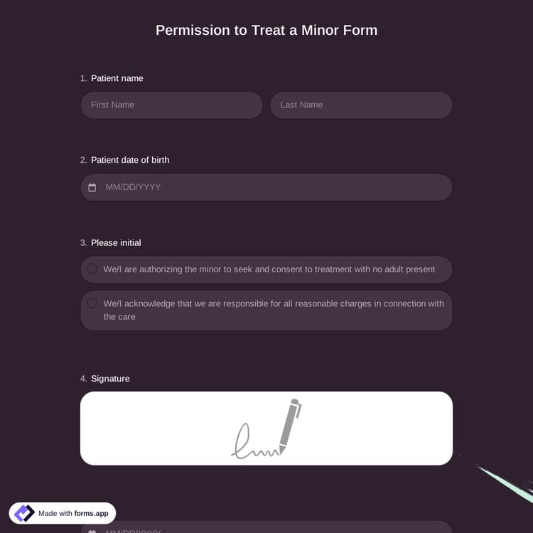 In order to get consent to medical treatment of a child from parents, you have to inform them about the medical outcomes and explain the risks involved. In forms.app, you can easily achieve this by adding an explanation field. Then you can ask a few questions for recording the medical history and add a signature field for getting e-signatures. Similar to a child care authorization form, a permission to treat a minor form asks for the following information: