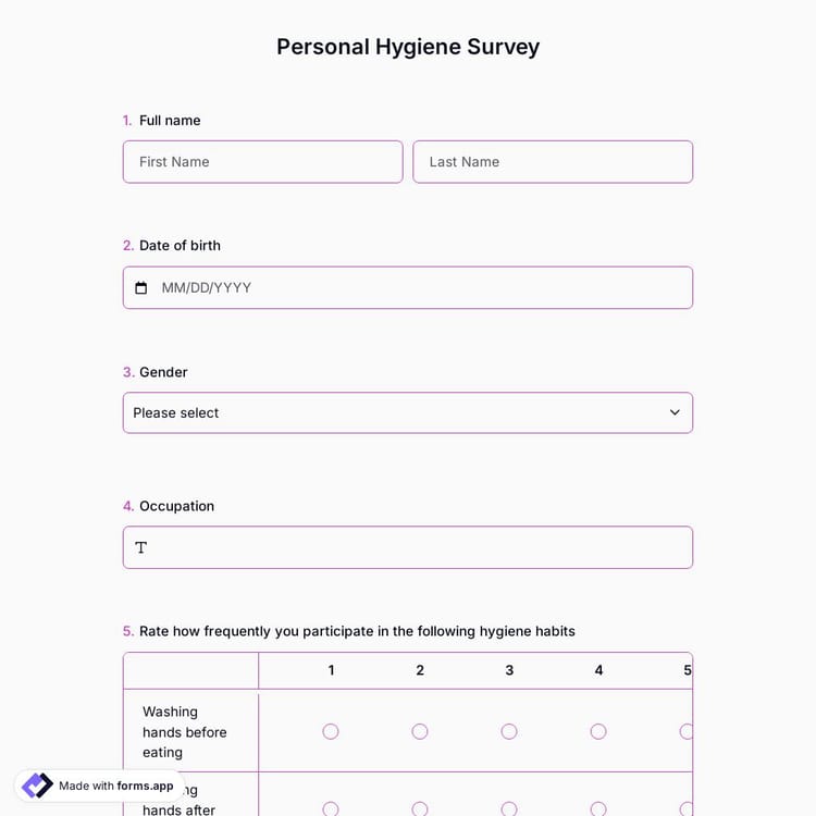 Personal hygiene is important to prevent infectious diseases, and promoting good hygiene practices can help improve overall health and well-being. To create your survey, select forms.app's free survey template and follow the steps below.
