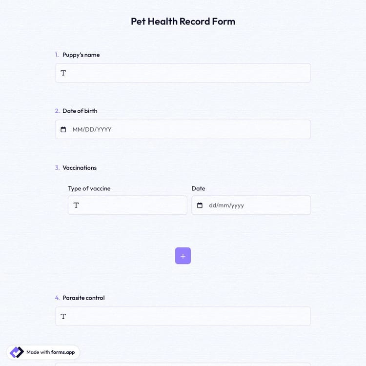 Do you want to keep track of pets' information in a more organized way? By using the Pet health record form template, you can keep the important information about pets together without even adding questions. You can get started quickly using forms.app!