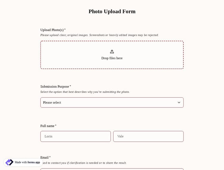 Whether you organize a photo contest or collect photos for customer support, an upload form will present a practical way to collect necessary documents. With an online form, people enter some basic information, such as name and contact information, and upload their photos, images, videos, or other relevant documents effortlessly.