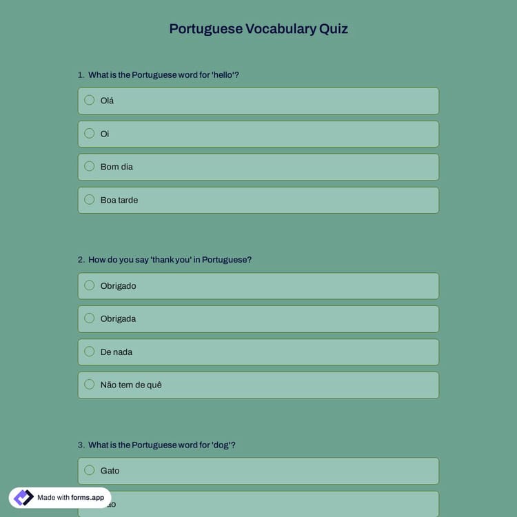 With the Portuguese vocabulary quiz template from forms.app, you can create engaging quizzes to test knowledge or practice new words. Click “Use Template” now to start your journey!