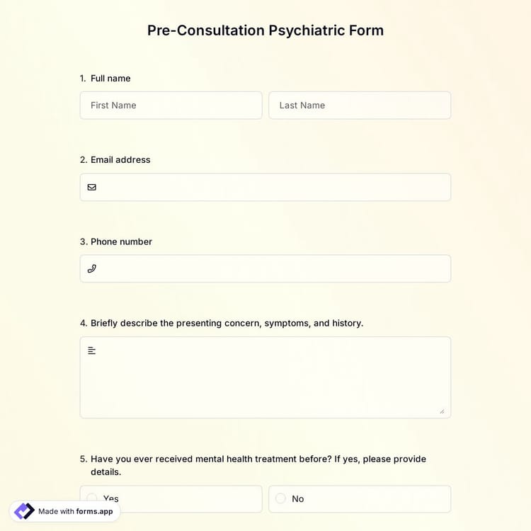 Online forms are a great chance for a professional way to streamline your pre-consultation process for psychiatric care. This pre-consultation psychiatric form template helps collect patient details securely and efficiently. Start personalizing it now with forms.app and provide better care from the first interaction!