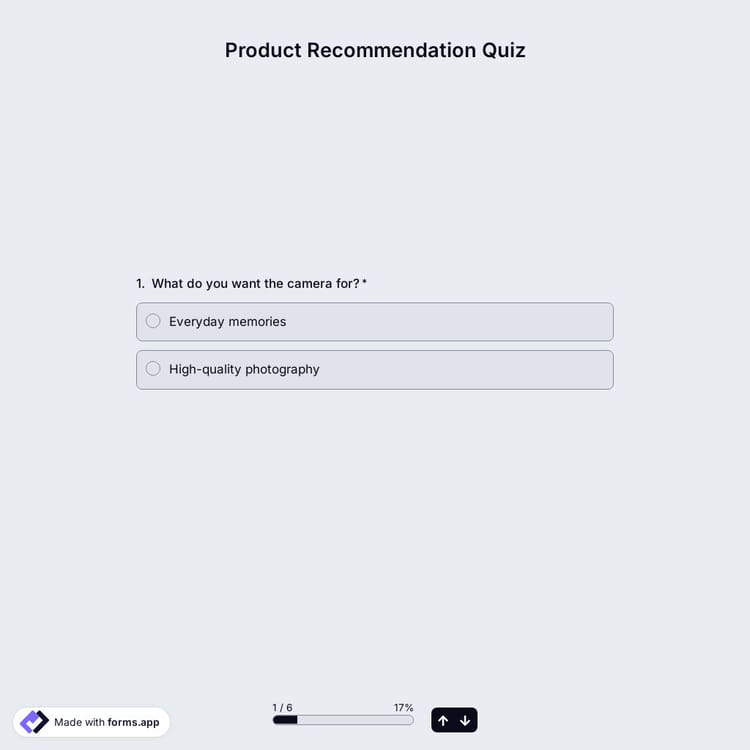 Just tell us how you would like to have a personalized product recommendation quiz for your specific needs. forms.app’s free AI quiz builder will create a free template for you in seconds.