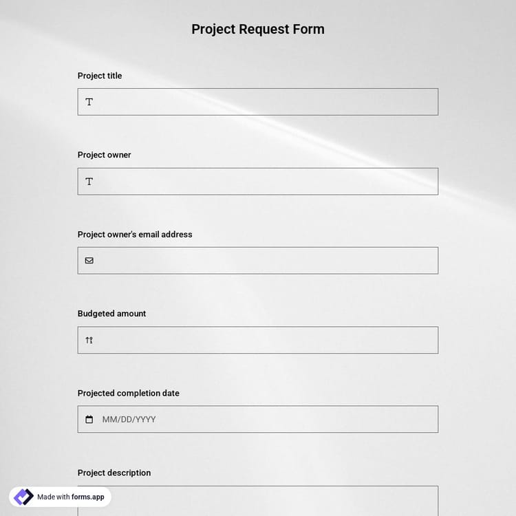 Questions and fields in a project request form may vary according to the work type or the project management team. But most of them include some similar questions about the projects. For example, the project title, personal information of the team members, the type of the project, and contact details of the project team are required for starting the review process. So, by using these customizable request templates as a base, you can edit the form questions and change the design as you want. Furthermore, forms.app provides countless free themes and handy features for your design. With forms.app’s project request form template makes the request process easy for everyone!
