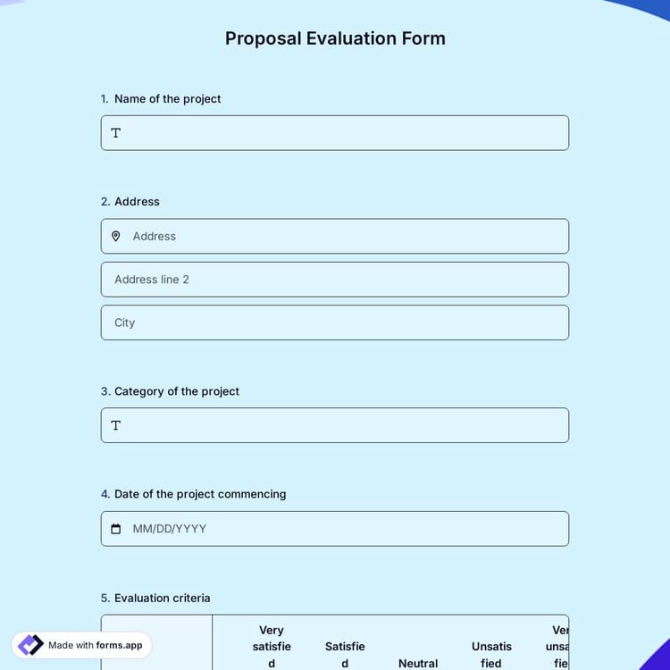The proposal evaluation form is used by companies to gather partnership requests, messages about potential business deals online and gather contact details. Use this free proposal evaluation form template to monitor offers and asses their potential by embedding it on your website. You can create your own form with a few clicks on forms.app.
