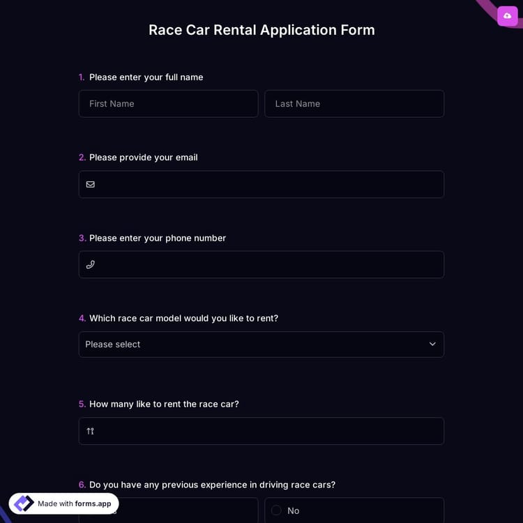 View this race car rental application form and click on "use template" after making sure this is what you are looking for.