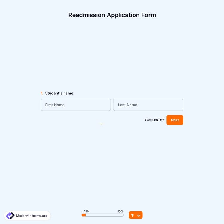 Every school will need a readmission application form, and you can freely create it on forms.app. Thanks to being online, students can fill out this form on your website, and you can review these forms easily and in an organized way. Get started right now using the readmission application form template!