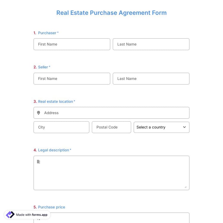 There are many things to consider when creating a real estate purchase agreement. To make sure there aren’t important things you left out, we will help you with some information, and we also include crucial stuff in our free online real estate purchase agreement form template.