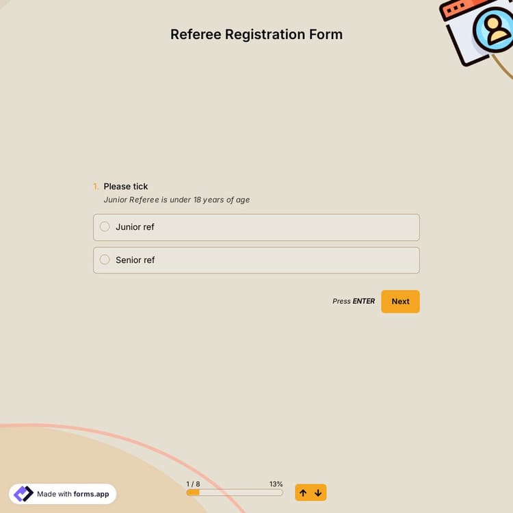 With referee registration forms, you can collect information from prospective referees who wish to register, including previous refereeing experience, certificates or licenses, and eligibility. The information you collect makes it easier for you to identify a person who will ensure a fair and safe playing environment.