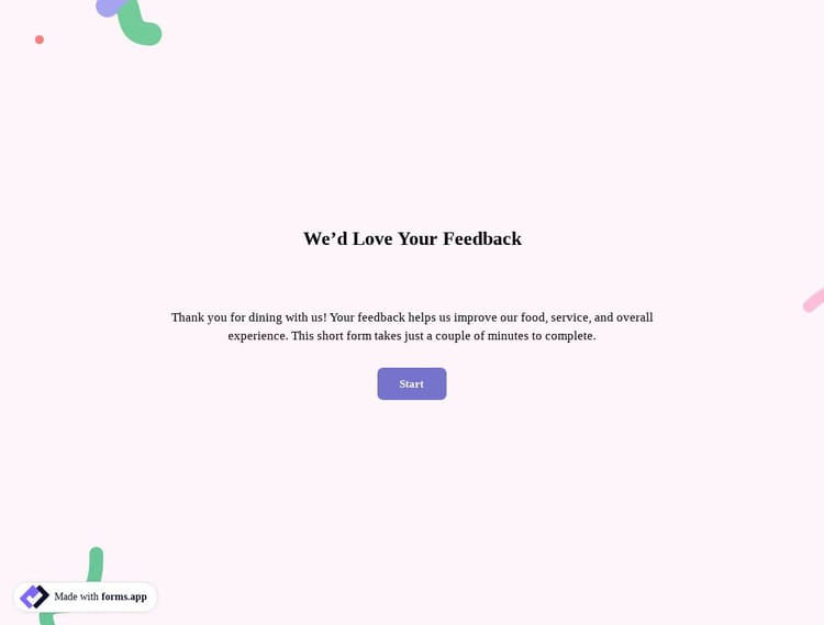 The restaurant feedback form receives customer comments about the restaurant's services, quality, and staff. This feedback form allows you to improve your service by measuring customer satisfaction. The improvements you will make by considering the answers to this form will help increase customer satisfaction and loyalty. You can use this form in a second and create your own.