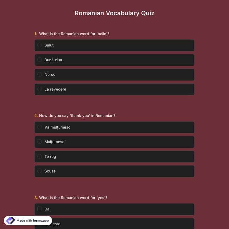 With forms.app’s free Romanian vocabulary quiz form template, you can quickly build interactive quizzes that help learners expand their vocabulary and track their progress. Open this customizable template now and start creating your own quiz effortlessly!