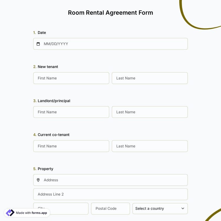 In order to reduce the form generation time, forms.app offers you expertly designed booking form samples. This allows you to start using your form by only editing the rental terms according to the state or country you live in. Once you have opened the room rental agreement form template on forms.app, you will have all the standard sections for a residential lease agreement.
