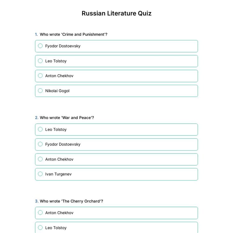 A Russian literature quiz is a tool to test your understanding of famous works, authors, and literary movements from Russian history. Covering everything from the Golden Age of Pushkin to the modernist works of Nabokov, this quiz template is ideal for educators, book clubs, and literary events.