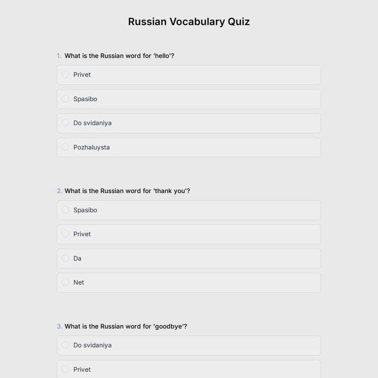 Expand your language skills or challenge your students with our interactive Russian vocabulary quiz template. This customizable form is perfect for educators, learners, or quiz enthusiasts eager to test their knowledge. Click "Use Template" to start for free!