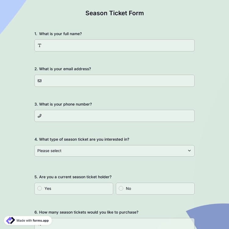 Do you need an efficient means to sell your season tickets for your organization’s next event? Take the first step with forms.app’s season ticket form template and build your own season ticket form without putting too much effort!