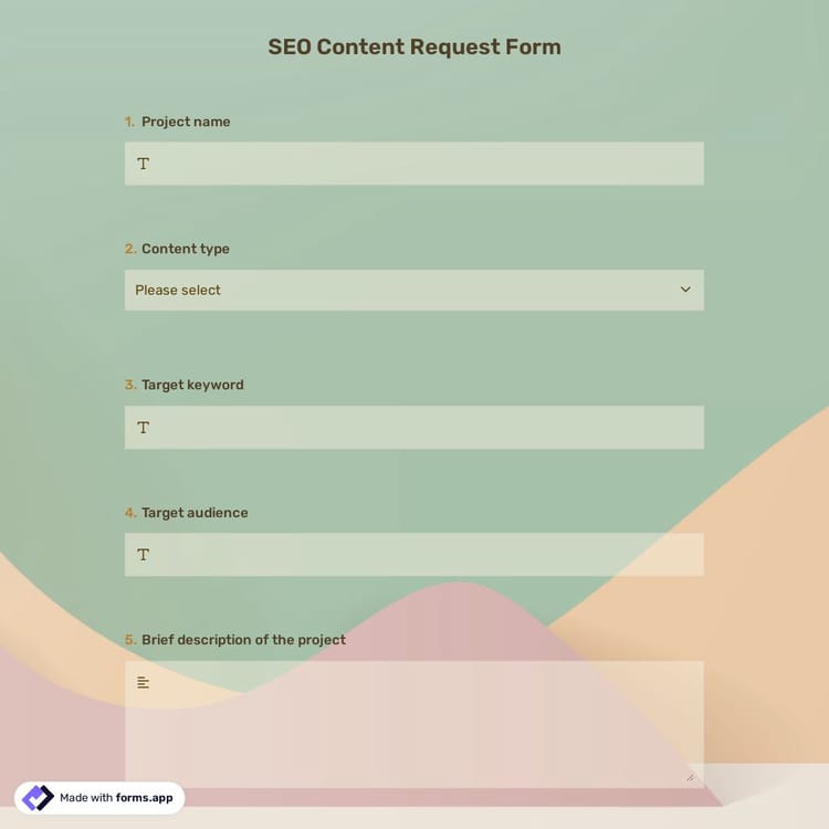 An SEO content request form is a tool used to gather content needs, keywords, and target goals from marketing or product teams. With this template from forms.app, your content creation process becomes more organized and efficient. Click “Use Template” to streamline your requests now!