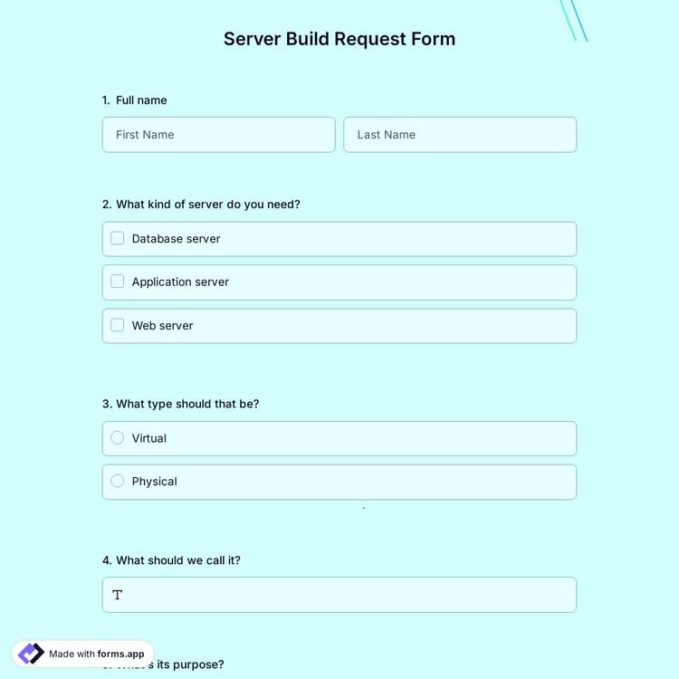 A server request form is a document that you can use collect request about servers or survey updates for a software or hardware product. Modify this server request form template’s design and customize the fields and questions to suit your needs. You can create your server build request form with just a few steps.