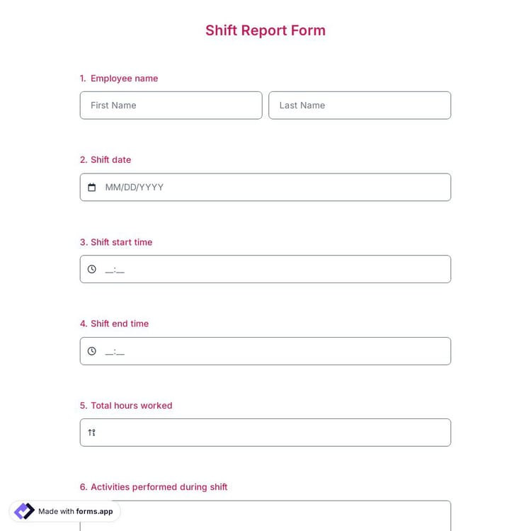Effortlessly track shift activities and ensure smooth handovers with a shift report form. This form template helps you document important details like completed tasks, incidents, and updates from one shift to the next. Get started for free today!