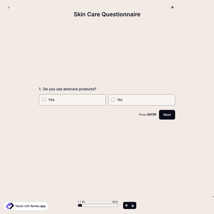 A skin care questionnaire is an instrument for learning about a person's skin care requirements and preferences. Dermatologists, estheticians, and skin care companies can utilize it to comprehend the distinctive features of a person's skin and spot any possible issues or places for development in their skincare regimen. Thanks for the forms.app, you can create your questionnaire in no time.