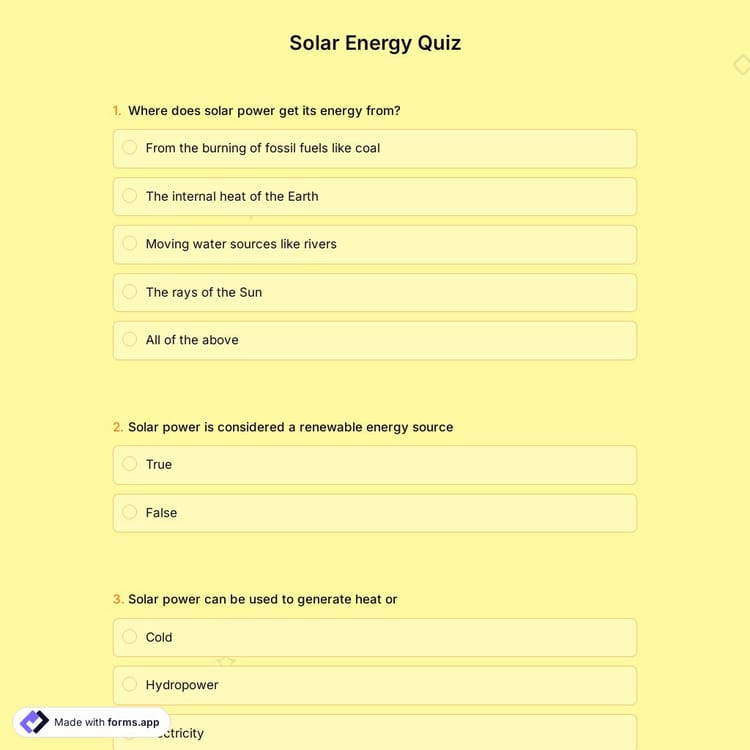 Use an online quiz to measure your audience’s knowledge about solar energy or assess their opinions. You can address and reach the people you want with an online quiz. Use forms.app’s free solar energy quiz template to raise awareness and create your quiz today!
