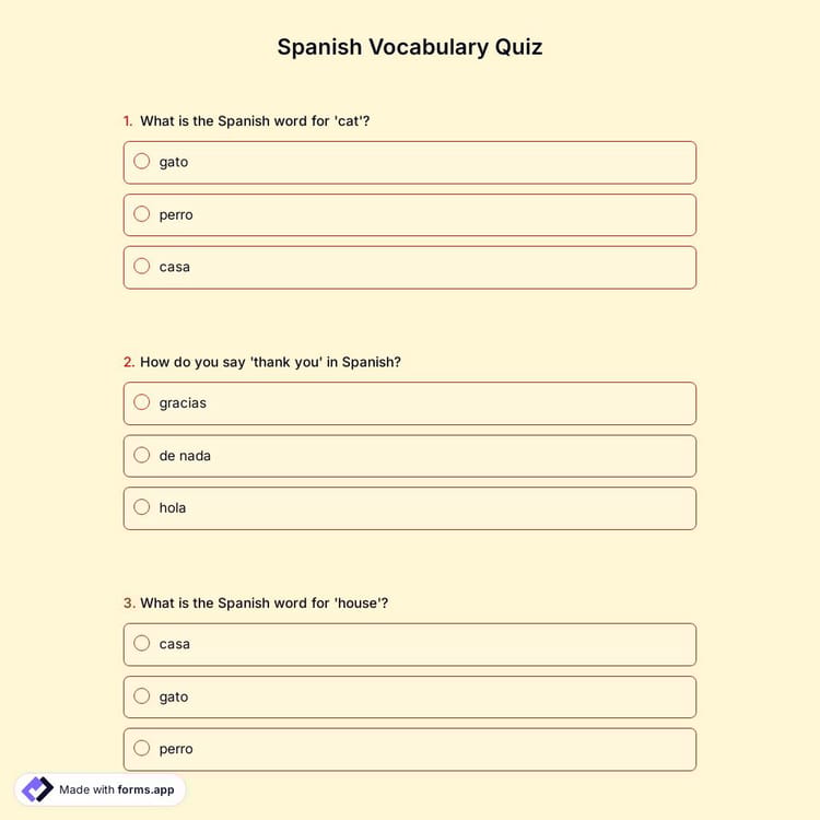 Easily create a Spanish vocabulary quiz form template with forms.app! Test knowledge, customize questions, and collect answers online for free.