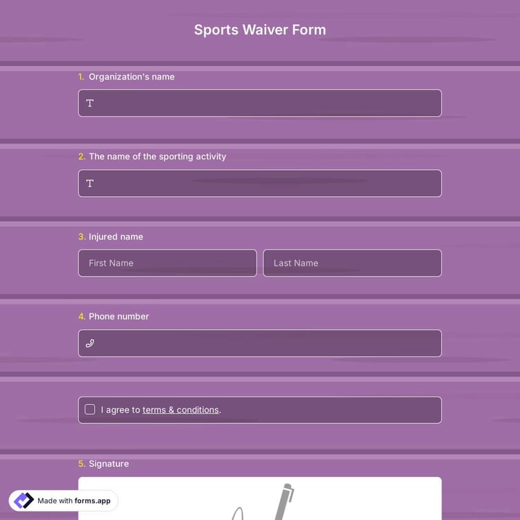 Creating a sports waiver form is easy with forms.app. Simply select a waiver form sample that best suits your needs and then customize it to include all of the relevant information. You can then collect online consent by sharing it electronically with those who need to sign it. Protect your organization today with a sports waiver form.