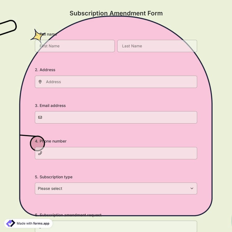 A subscription amendment form allows users to request changes to their current subscription plan, such as upgrading, pausing, or modifying billing details. With this customizable template by forms.app, businesses can handle updates quickly and reduce customer service workload. Click “Use Template” to get started!