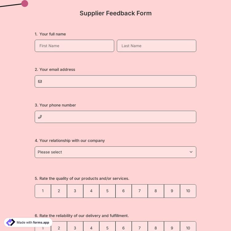 Online forms are helpful for you to gain insights into how your suppliers are performing. With a supplier feedback form, you can collect valuable data on their service quality, communication, and delivery performance. Click "Use Template" to get started for free today!