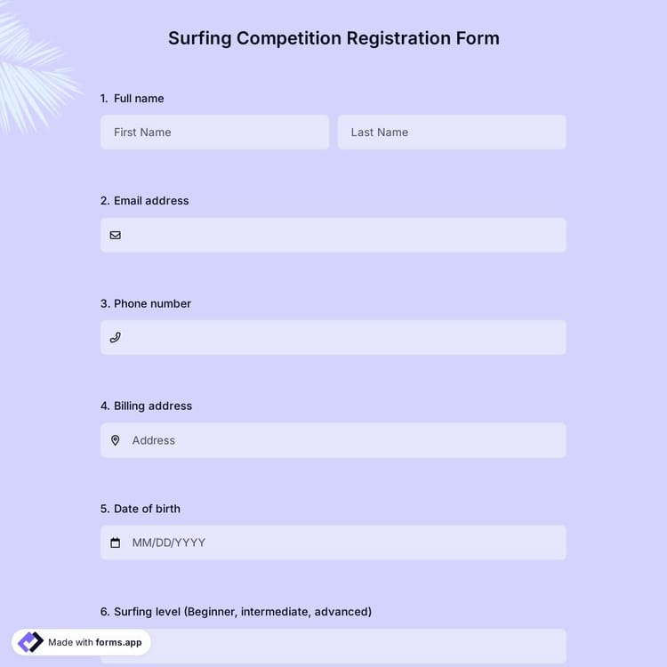 This free surfing competition registration form template lets you collect participant details, categories, and waivers online. Customize it to match your event branding and start accepting registrations in minutes.