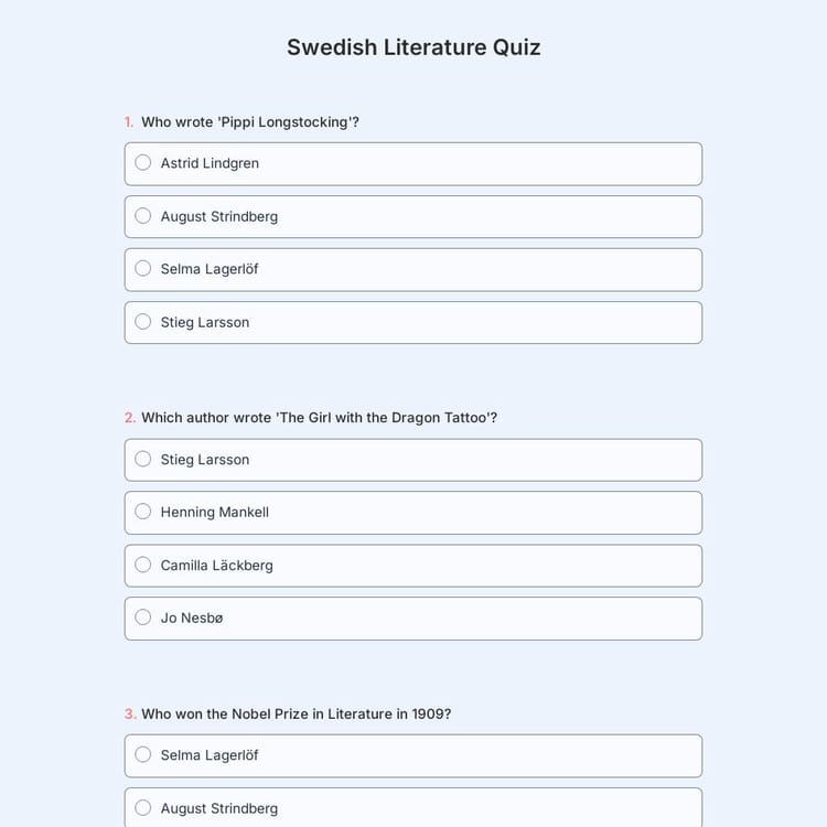 A Swedish literature quiz is an interactive way to test knowledge about classic and modern Swedish authors, novels, and literary movements. It covers iconic writers like Selma Lagerlöf, August Strindberg, and Astrid Lindgren, offering an enjoyable way for participants to connect with Swedish culture and history.