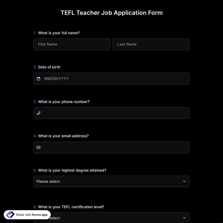 View this tefl teacher job application form and click on "use template" after making sure this is what you are looking for.