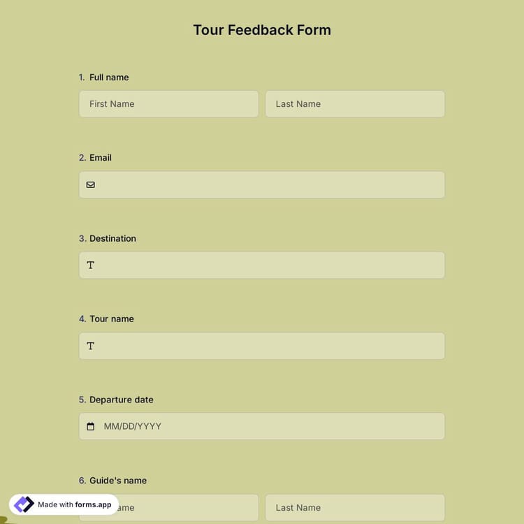 The staff performance during the tour or trip can be assessed using this document. The name, contact information, tour guide's name, and trip information are all requested in the form sections on this tour feedback form. You may find out what people think about lodging, transportation, food, safety, prices, and professionalism by using tools like star rating fields. Don't forget the check the features to make improvements to your form and get feedback in the right way.