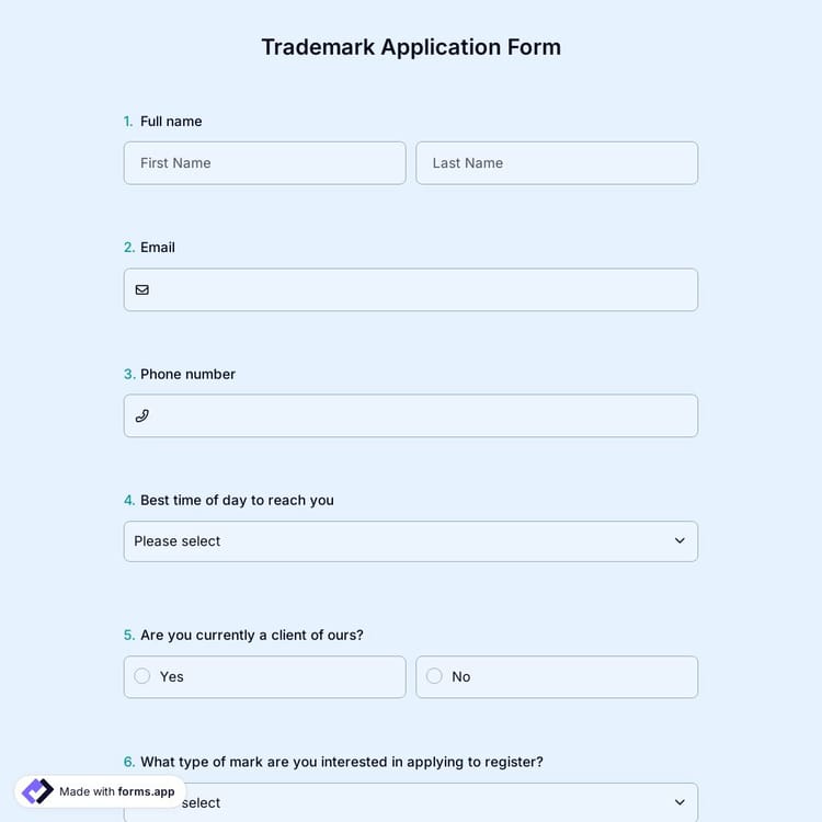 A trademark application form is an online document used to apply to the relevant government agency in your country to get a trademark. This application form contains form fields asking about the applicant's information and trademark details.