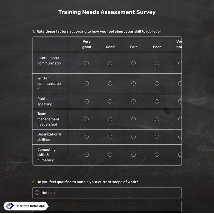 Every firm wants to know about and develop the competencies of its employees. When it comes to creating and sustaining a thriving business, it is very important to assess the training needs of your employees. It is very easy to do this by creating a training needs assessment survey by simply clicking a few buttons on forms.app!
