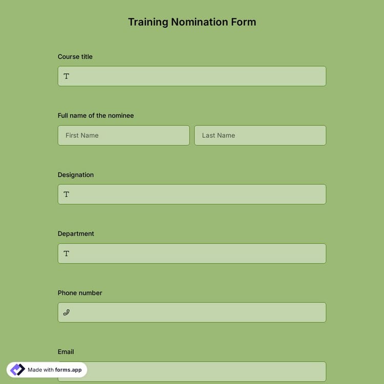 The training nomination form is a document containing the information of the trainees. With these employment form templates, you can collect employee signatures and store much necessary information online. Moreover, forms.app's app also lets you fill out your forms from anywhere.