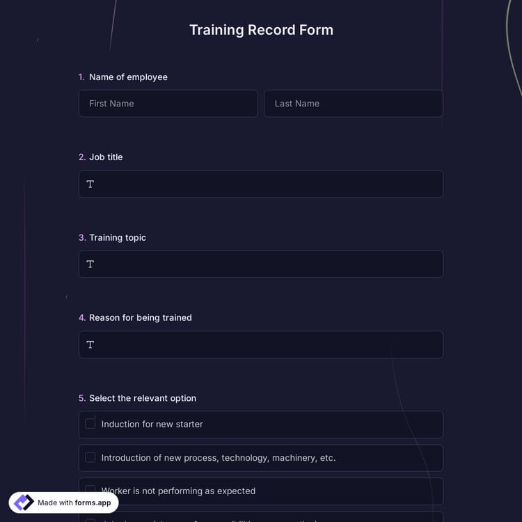 A training record form is an online document that records the completed training. It is a written and signed form stating that all training given to your employee has been provided. Whit this registration form, you can get training records practically. You can create a professional-looking training record form on forms.app in seconds without any code.