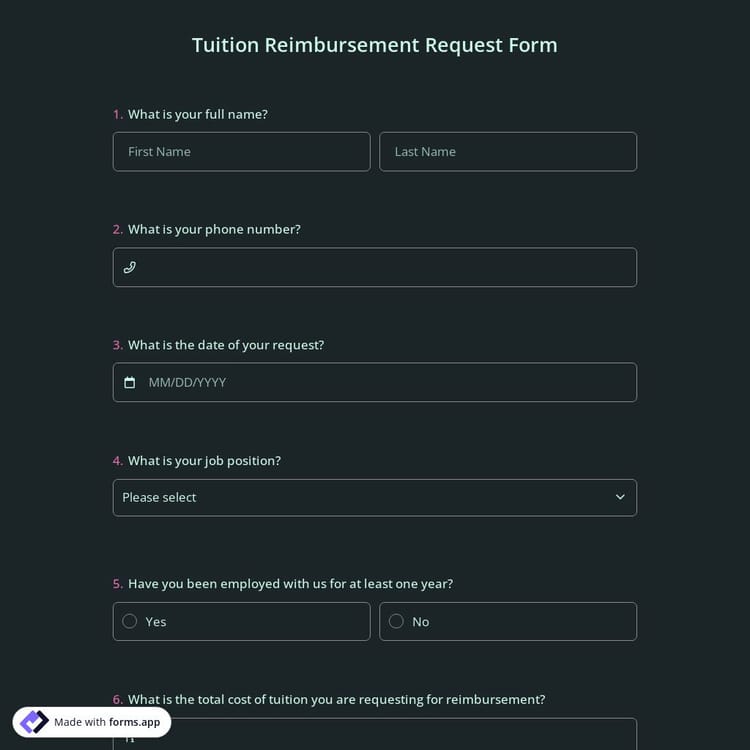If you want to track, organize and manage the tuition reimbursement applications that your customers make for themselves or their children, this application form template is for you. forms.app offers you this free and customizable tuition reimbursement template.