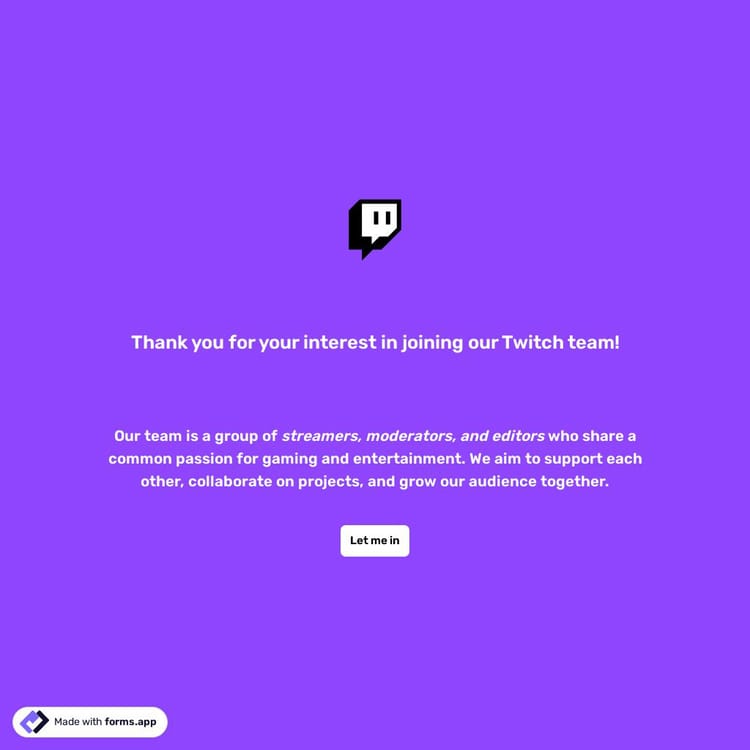 Are you looking for team members to stream together on Twitch? You can find your team members and start a Twitch team for your channel by using our Twitch team application form template to create your own form here and partner with other streamers.