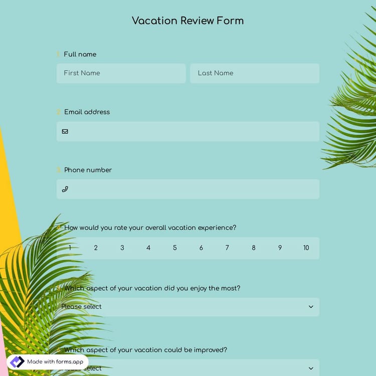 A vacation review form is used to gather feedback from travelers after a trip or tour. With this fully customizable template from forms.app, travel businesses can evaluate customer satisfaction, improve their services, and build trust with future clients. Click “Use Template” to get started for free!