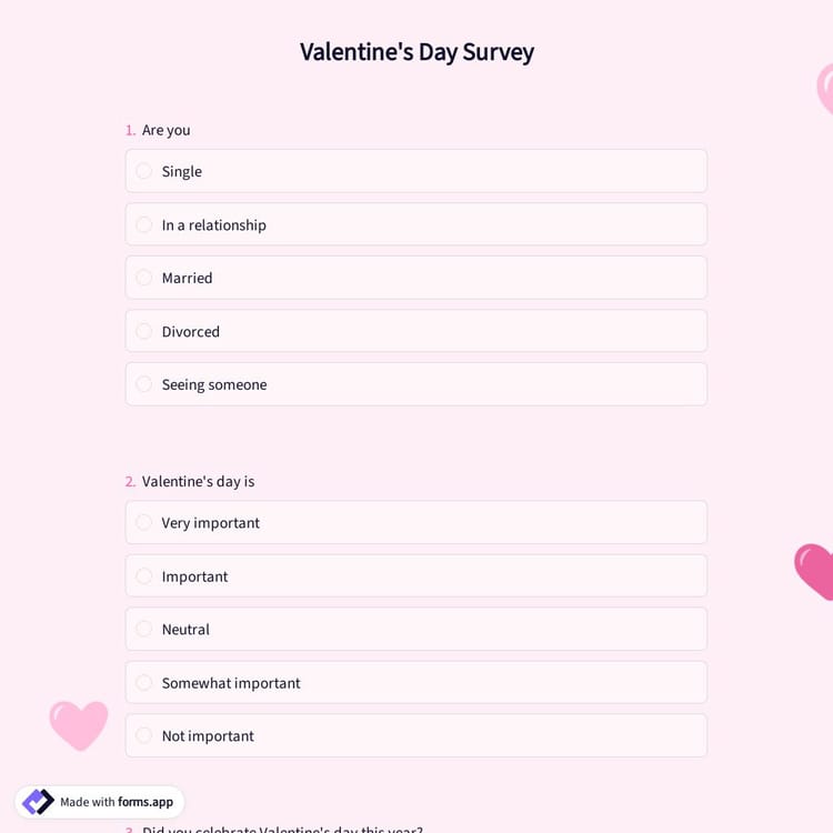 An effective method for learning about people's thoughts and actions about the event is a valentine's day survey. Businesses, event coordinators, and merchants may utilize it to comprehend how people celebrate valentine's day and what they value in presents and experiences. With forms.app’s free valentine's day survey template, you can create your survey in no time!