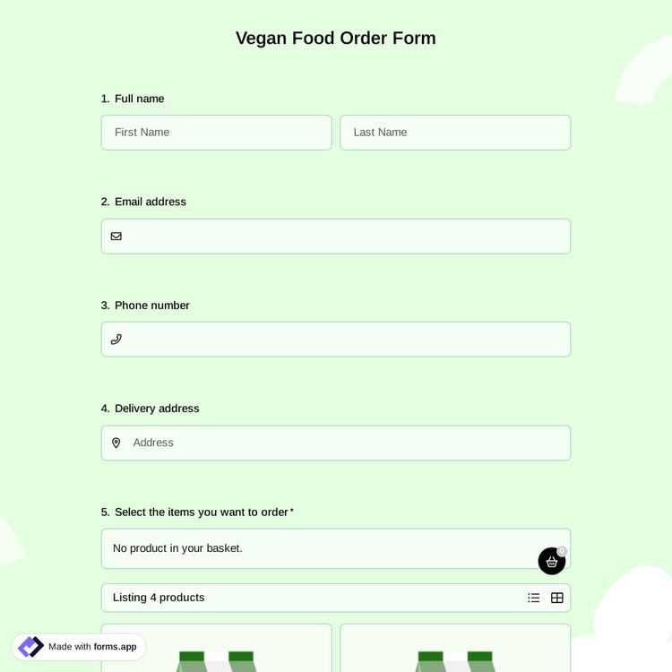 Digital forms streamline your vegan food ordering process. With forms.app’s vegan food order form template, you can collect orders online effortlessly. Customize this template to display your vegan menu and start taking orders today.