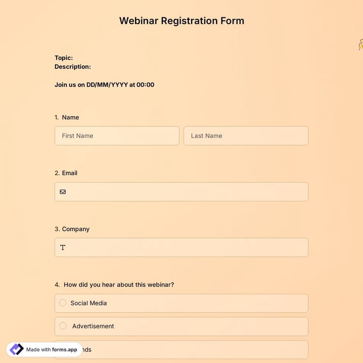 You can use forms.app’s webinar registration form template to reserve seats for your next online webinar! You can quickly start with this ready-to-use form template, customize it according to your needs, and publish through any channel without losing time. If you’d like to, you can also embed it on your webinar registration page! It’s totally free and requires no coding skills.