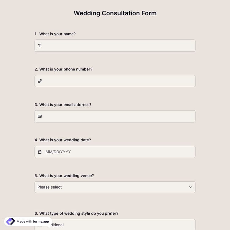 If you want to gather your customer wedding requests, creating a wedding consultation form is precisely what you seek. forms.app offers this online and free template to redesign and make any changes you want. Open this template and start using smart features without coding. Click the ‘’Use Template’’ button.