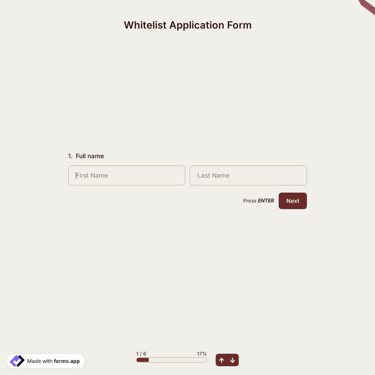 A whitelist application form is a type of document to collect information about people who want to be whitelisted in your project. People in the whitelist often gain some privileges due to their early interest in a project. In order to select the right persons to be whitelisted, you can create an application form on forms.app and collect relevant data in a convenient way.