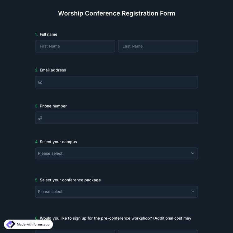 A worship conference registration form is an online tool designed to collect attendee details, session preferences, and ministry roles for a worship-focused event. Whether you're organizing a church conference, worship leadership training, or music ministry retreat, this ready-made worship conference registration form template makes sign-ups simple and organized. Click “Use Template” to get started for free!